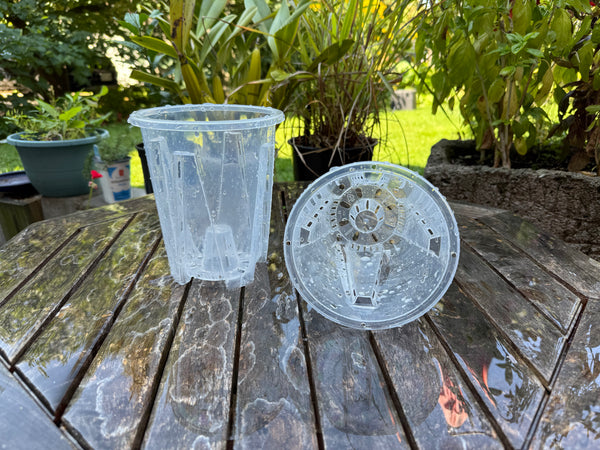 Very clear plastic pot with excellent drainage and side vents.